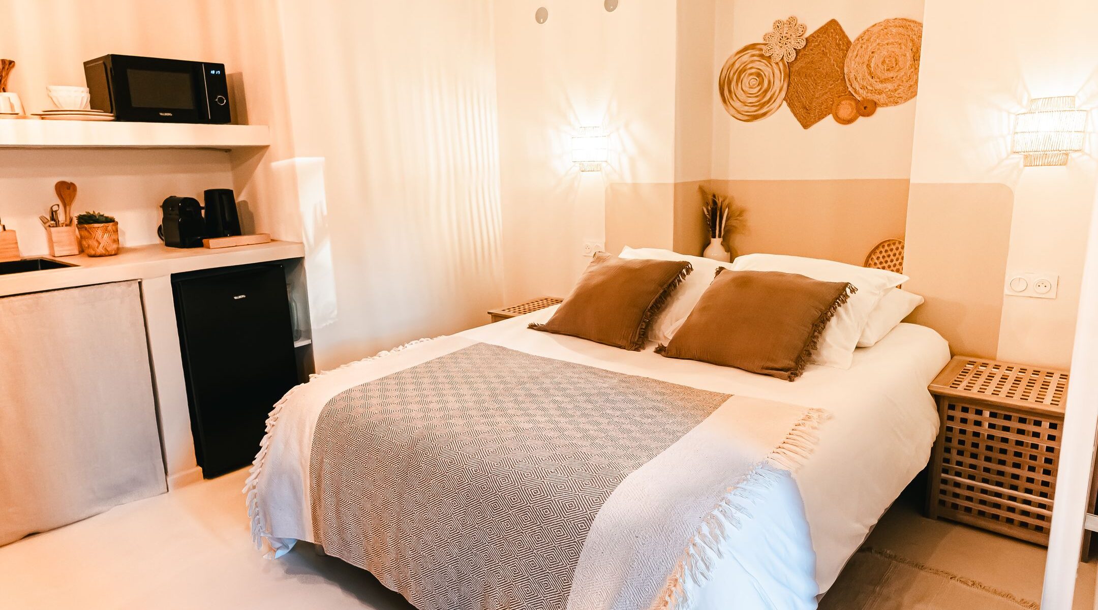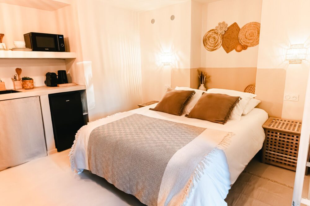 Les studios Cocoon des Îles, conçus pour deux personnes, vous accueillent dans un cadre intime et confortable. Profitez de lits généreux de 160 x 200 cm pour des nuits douces, et laissez-vous séduire par l'atmosphère cosy et apaisante de votre cocon privé.